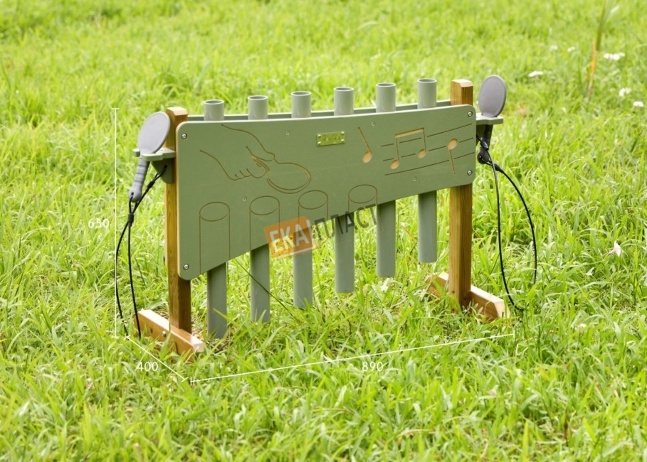 Тонгофон — очень популярный инструмент для маленьких детей. Звуки извлекаются с помощью гибкого молоточка в форме лопатки: им ударяют по верхнему открытому краю любой трубы, получая мелодичный звук типа «пок». Трубы разной длины издают разные ноты, поэтому на инструменте легко сочинять мелодии. В комплекте два гибких молоточка — это позволяет играть двумя руками или вдвоём, совместно. Инструмент неизменно нравится детям всех возрастов и способствует развитию крупной моторики, координации «глаз – рука» и музыкального восприятия. Особенности: - Набор из 6 труб из ABS‑пластика. - Трубы разной длины издают разные звуки. - Звук возникает, когда гибкий молоточек ударяет по верхнему (открытому) краю трубы. - В комплекте 2 молоточка на шнурке. - Можно использовать в помещении и на улице. - Стойка изготовлена из атмосферостойкой европейской сосны. - Молоточки — из прочного пластика. - Крупный размер труб помогает точнее попадать по ним. - Ноты расположены вертикально — это удобно для детей любого возраста. - Способствует самовыражению, улучшению координации «глаз – рука» и музыкальному развитию. - Высота стойки — 650 мм. - Инструмент можно переносить в любое нужное место.