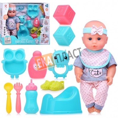 • В комплекте: бутылочка, горшок, тарелка, вилка, ложка, 2 кубика, погремушка, аксессуары.