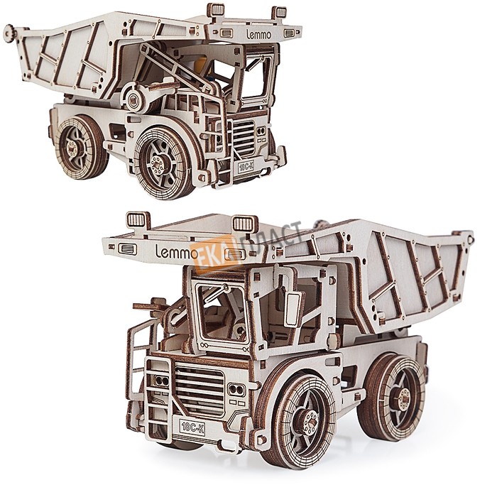 У собранной модели вращаются колеса, поднимается кузов, открывается задний борт кузова, откидывается кабина.