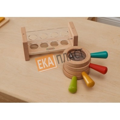 Набор из 4 луп с удобными деревянными ручками 4-х цветов (красный, синий, желтый, зеленый). В каждом имеется увеличительная линза с 3х - кратным увеличением. В комплект входит прочный деревянный органайзер для хранения.